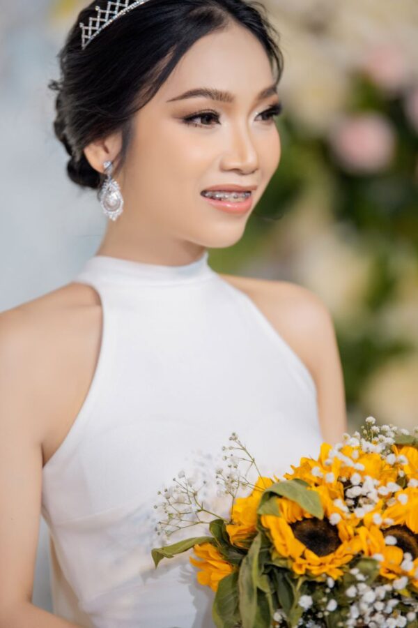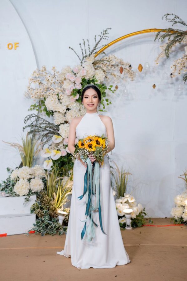 Step into pure elegance with Elysian Grace—a captivating gown that exudes timeless beauty and sophistication. The minimalist high-neck design contrasts beautifully with its flowing silhouette, creating an aura of ethereal charm. Perfect for the bride who embraces modern simplicity with a touch of classic refinement.