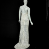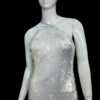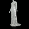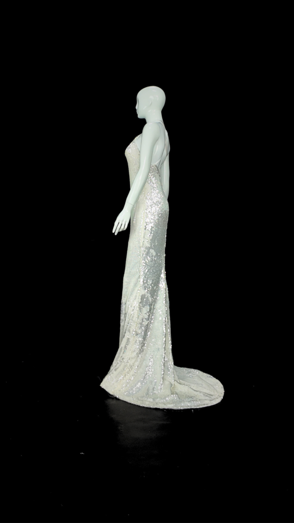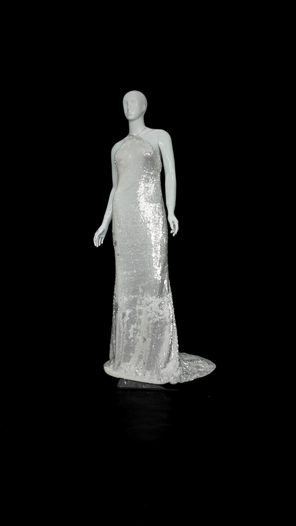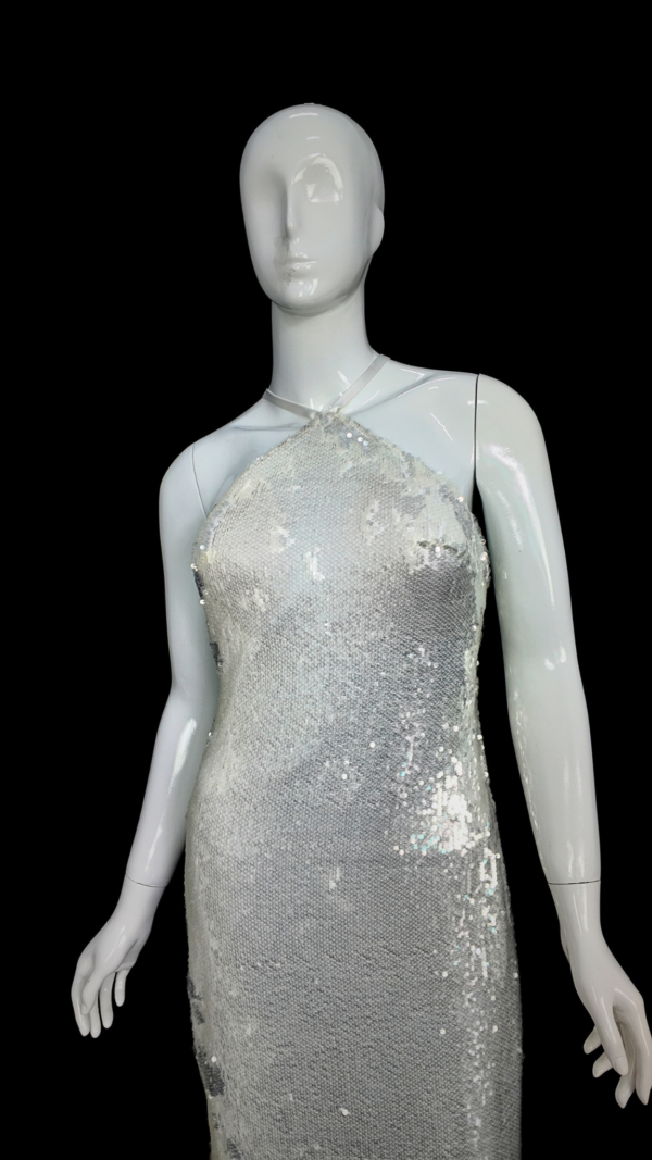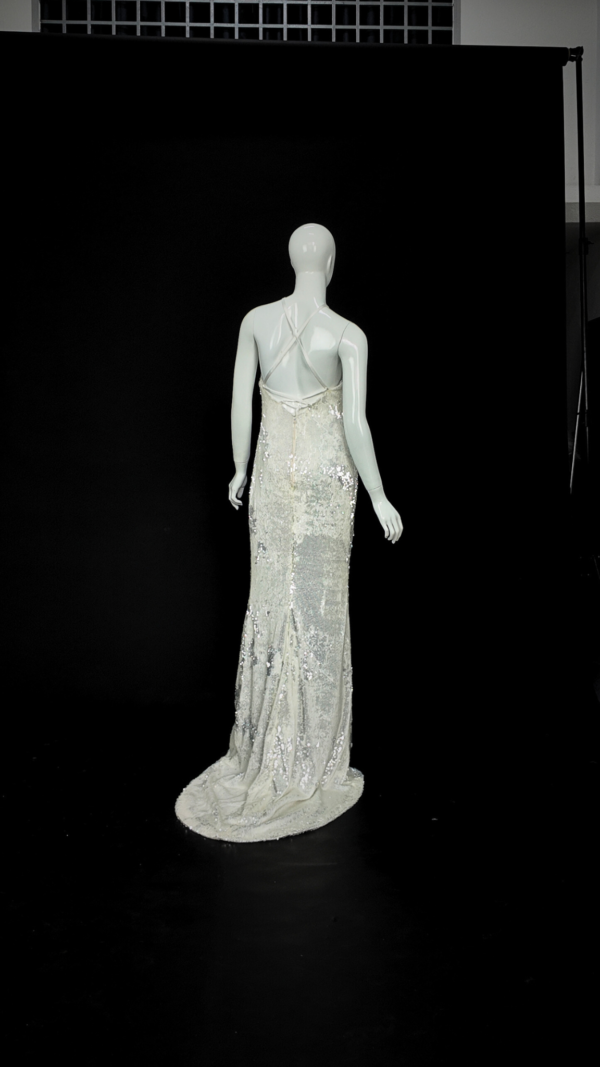 Slim mermaid gown in white scale sequins with a halter neckline, low back, and cross lace-up closure. Fully lined for comfort, finished with a sweeping train that shimmers like snow under night lights