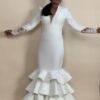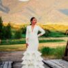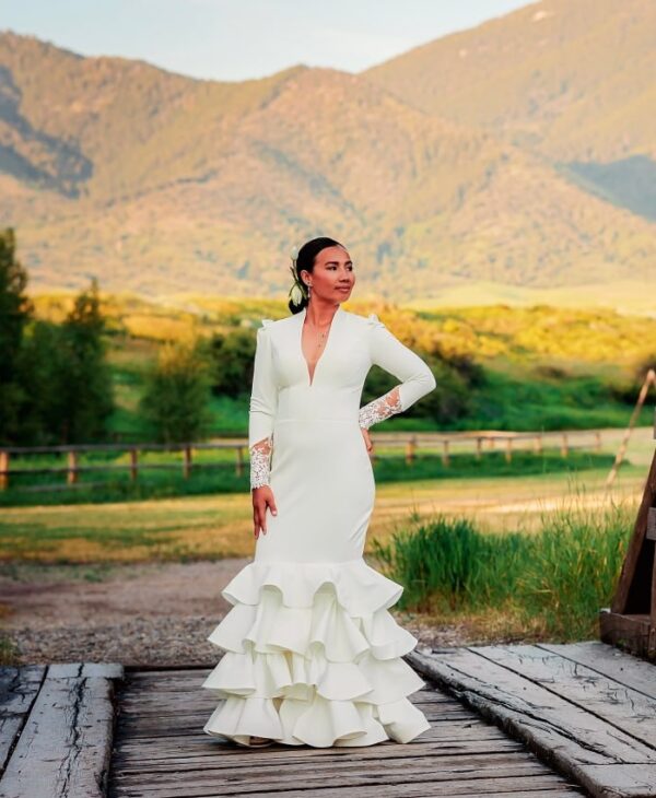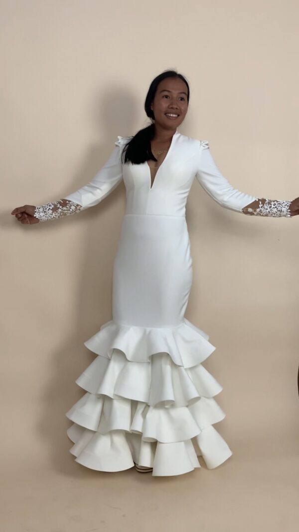 Embrace timeless elegance with Lustrous Lena, a stunning white wedding dress designed to leave a lasting impression. This masterpiece features a sleek, form-fitting bodice with a plunging neckline, complemented by graceful lace-trimmed sleeves for a touch of sophistication. The dress cascades into a dramatic, tiered ruffled skirt that adds both volume and flair to your every step. Perfect for outdoor weddings, countryside ceremonies, or chic modern events, Lustrous Lena is a tribute to refined beauty and exquisite craftsmanship.