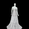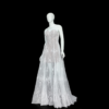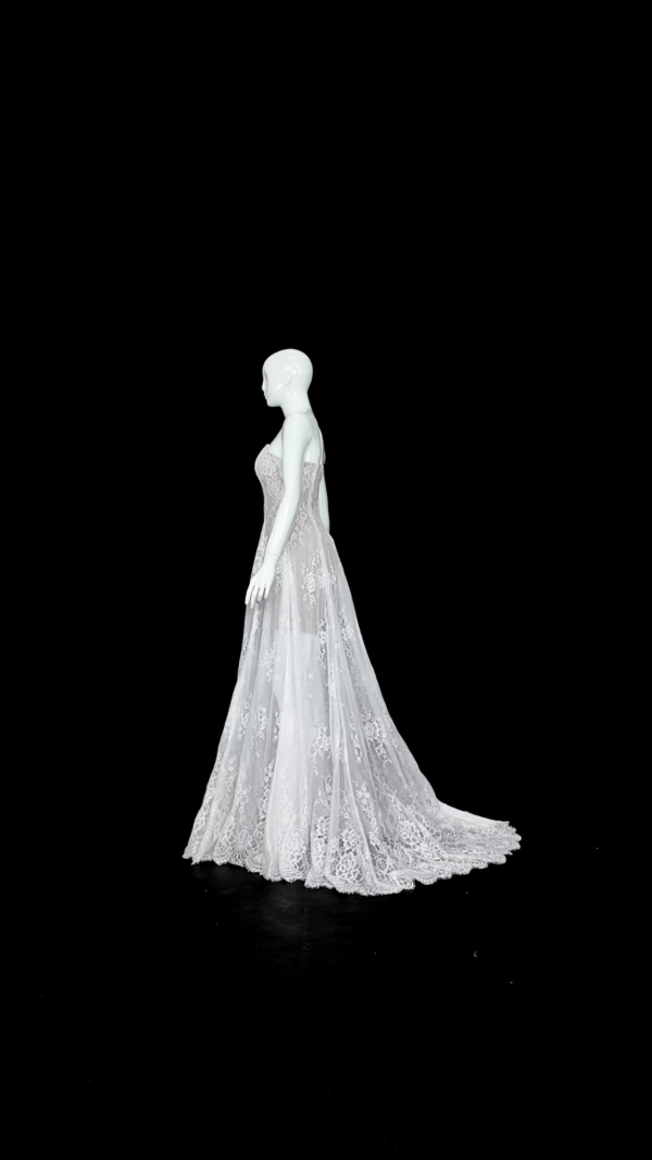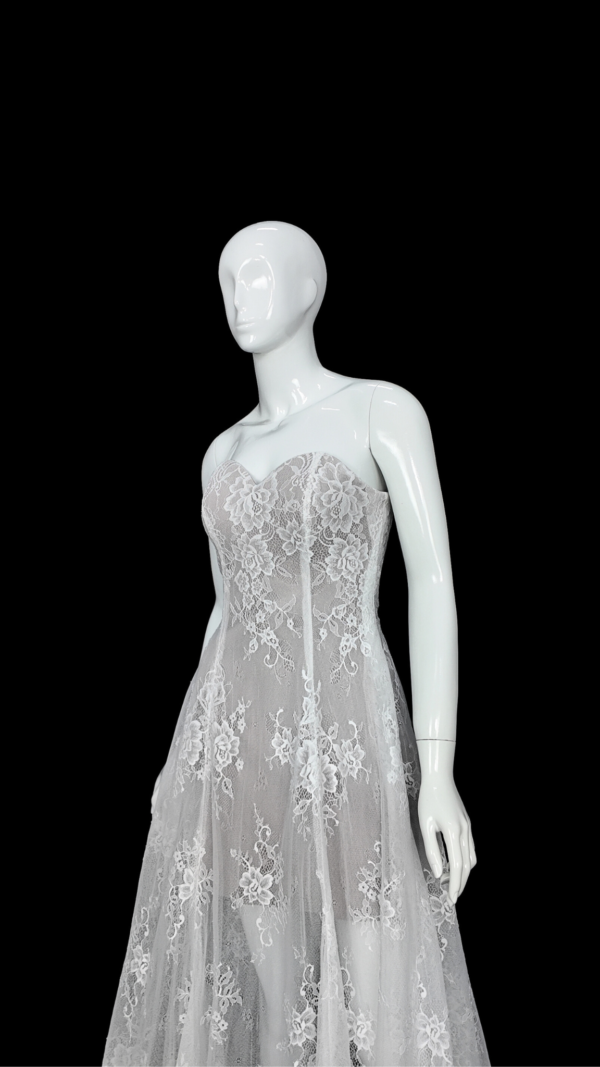 The Misty Rose gown is composed of two layers in contrasting shapes. The inner layer is a light nude cloud-purple mini dress, while the outer layer is crafted from thin Chantilly lace with a rosy texture. The lace overlay features a fitted bodice, a high invisible waistline, and a semi ball gown skirt. When combined, the layers create a soft blurring effect from the thigh upward, while leaving the legs romantically visible through the sheer lace. The design is finished with a wavy lace hemline, balancing sensuality with ethereal elegance.