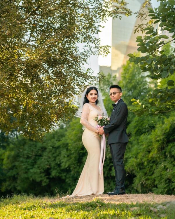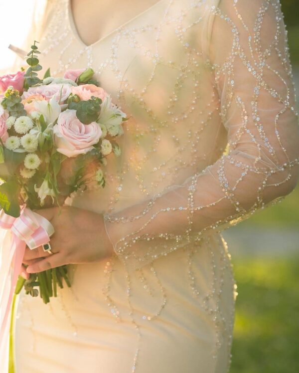 Radiate elegance with Opaline Dream—a breathtaking gown adorned with intricate beadwork that shimmers like dew in morning light. The sheer, fitted sleeves and graceful silhouette create a look that is both modern and timeless. Crafted for brides who wish to shine with understated luxury and ethereal beauty.