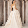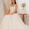 The Rachana gown features a ball gown silhouette with a fitted bodice with gold hand beading.