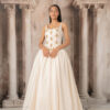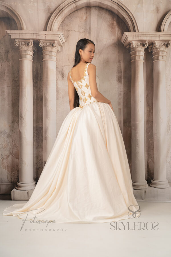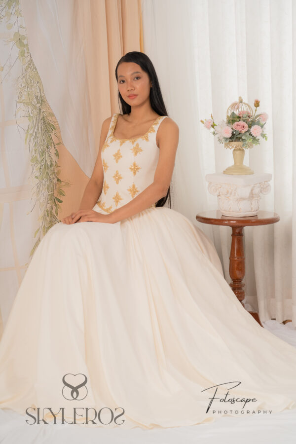 The Rachana gown features a ball gown silhouette with a fitted bodice with gold hand beading inspired by Cambodian traditional design. It is constructed with a basque waistline, finished in an off-white tone. This design blends Cambodian heritage details with a universal ball gown structure, creating a balance between tradition and timeless elegance.